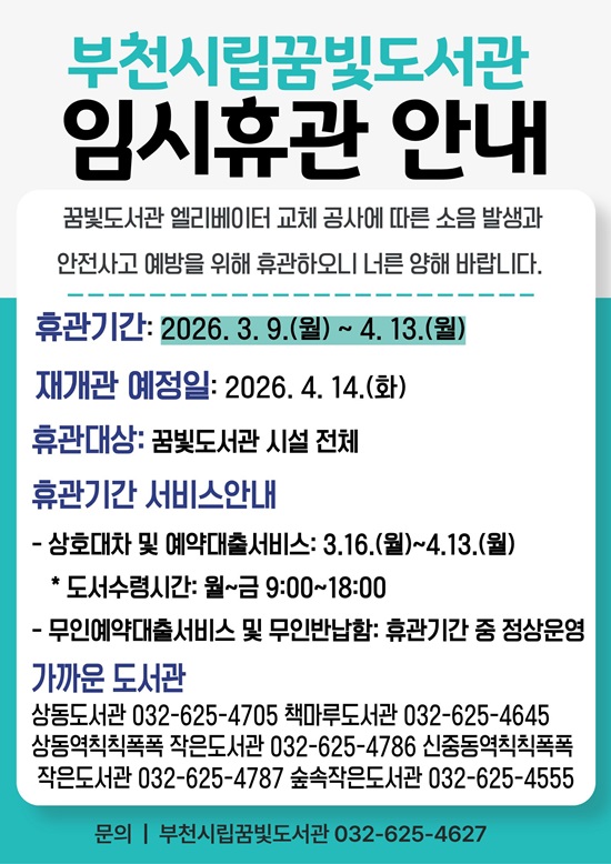 ºÎõ½Ã¸³ ²Þºûµµ¼­°ü, ¿¤¸®º£ÀÌÅÍ ±³Ã¼ °ø»ç·Î 3¿ù 9ÀϺÎÅÍ ÀÓ½ÃÈÞ°ü