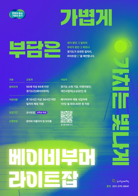 °æ±âµµ°¡ º£À̺ñºÎ¸Ó ¼¼´ëÀÇ ¾ÈÁ¤ÀûÀÎ ÀÏÀÚ¸® ÀçÁøÀÔÀ» Áö¿øÇÏ´Â ¡®¶óÀÌÆ®Àâ(Light Job)¡¯ »ç¾÷À» ¿ÃÇØµµ ÃßÁøÇϱâ·Î Çϰí, 2¿ù 2ÀϺÎÅÍ Âü¿©±â¾÷À» »ó½Ã ¸ðÁýÇÑ´Ù.