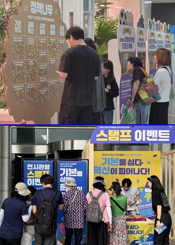 ºÎõ½Ãû 1Ãþ¿¡¼­ ¿­¸° ¡®Çõ½Å¡¤Àû±ØÇàÁ¤ Àü½Ãȸ¡¯¸¦ ãÀº ½Ã¹ÎµéÀÌ Á¤Ã¥³ª¹«¿¡ ¡®BEST of BEST »ç·Ê¡¯¸¦ ÅõÇ¥Çϰí ÀÖ´Ù. ¾Æ·ª´Â ½Ã¹ÎµéÀÌ ½ºÅÆÇÁ ºÎ½º¿¡¼­ À̺¥Æ®¿¡ Âü¿©ÇÏ´Â ¸ð½À.(»çÁø= ºÎõ½Ã Á¦°ø)