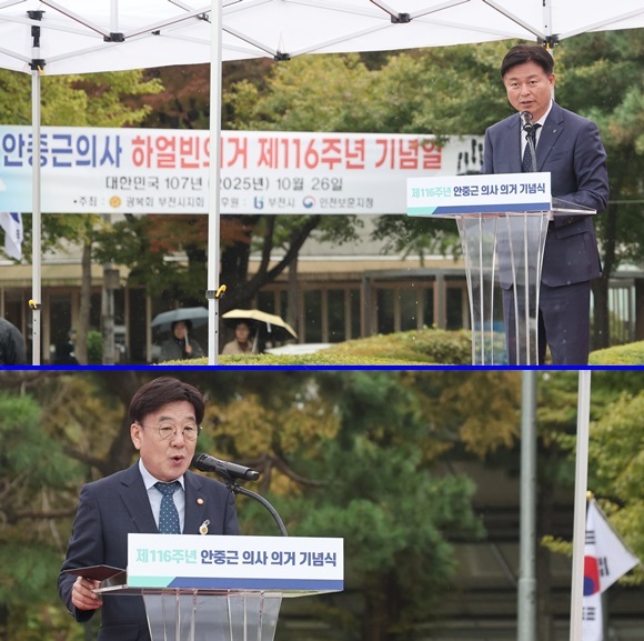 Á¶¿ëÀÍ ºÎõ½ÃÀåÀÌ 26ÀÏ ¿­¸° ¡®¾ÈÁß±Ù ÀÇ»ç ÀǰŠÁ¦116Áֳ⠱â³ä½Ä¡¯¿¡¼­ ±â³ä»ç¸¦ Çϰí ÀÖ´Ù. ¾Æ·¡´Â ÀåÇз¡ ±¤º¹È¸ ºÎõ½ÃÁöȸÀåÀÌ ¾ÈÁß±Ù ÀÇ»ç ¾àÀü º¸°í¸¦ Çϰí ÀÖ´Ù.(»çÁø= ºÎõ½Ã Á¦°ø)