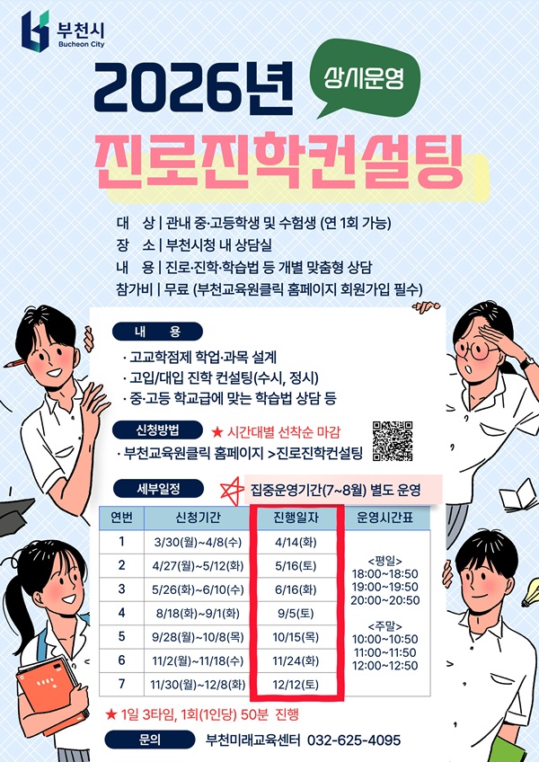 Âü¿© ´ë»óÀº ºÎõ½Ã ¼ÒÀç Áß¡¤°íµîÇлý°ú ¼öÇè»ýÀ̸ç, ¿¬ 1ȸ ½ÅûÇÒ ¼ö ÀÖ´Ù. 4¿ù 14ÀÏ Ã¹ »ó´ã Âü¿©¸¦ Èñ¸ÁÇÏ´Â ½Ã¹ÎÀº 3¿ù 30ÀϺÎÅÍ 4¿ù 8ÀϱîÁö ºÎõ¹Ì·¡±³À°¼¾ÅÍ ºÎõ±³À°¿øÅ¬¸¯ ȨÆäÀÌÁö(¤ý¹Ù·Î °¡±â Ŭ¸¯)¸¦ ÅëÇØ ¿Â¶óÀÎÀ¸·Î ½ÅûÇÏ¸é µÈ´Ù.