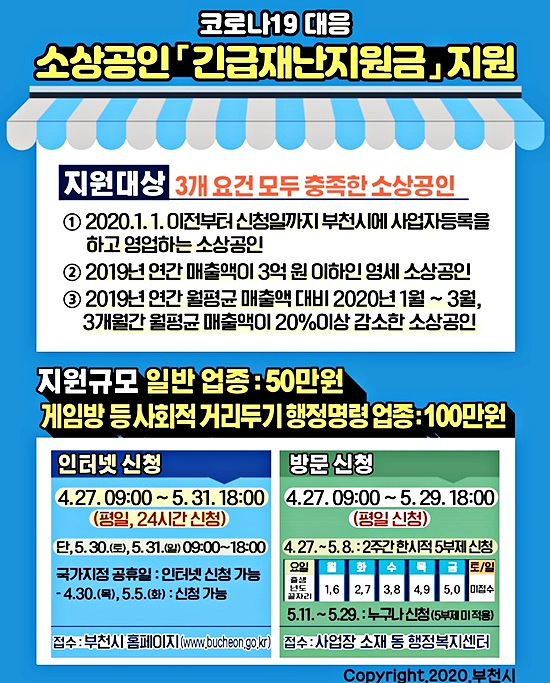 ºÎõ½Ã ¼Ò»ó°øÀÎ ±ä±ÞÀç³­Áö¿ø±ÝÀÇ Áö¿ø ´ë»óÀº ÃÑ 3¸¸7õ200¿©¸íÀ¸·Î ¡ã2020³â 1¿ù 1ÀÏ ÀÌÀüºÎÅÍ ½ÅûÀÏ ÇöÀç±îÁö »ç¾÷ÀÚµî·ÏÀ» ÇÏ°í ¿µ¾÷ÇÏ´Â ¼Ò»ó°øÀÎ, ¡ã2019³â ¿¬°£ ¸ÅÃâ¾×ÀÌ 3¾ï¿ø ÀÌÇÏÀÎ ¿µ¼¼ ¼Ò»ó°øÀÎ, ¡ã2019³â ¿¬°£ ¿ùÆò±Õ ¸ÅÃâ¾× ´ëºñ 2020³â 1~3¿ùÁö 3°³¿ù°£ ¿ùÆò±Õ ¸ÅÃâ¾×ÀÌ 20% ÀÌ»ó °¨¼ÒÇÑ ¼Ò»ó°øÀÎ µî 3°¡Áö Á¶°ÇÀ» ¸ðµÎ ÃæÁ·ÇÏ¸é µÈ´Ù.