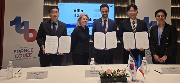 ¿ÞÂʺÎÅÍ ³²µ¿°æ ºÎõ½Ã ºÎ½ÃÀå°ú ÇÇ¿¡¸£ ¸ð¸£ÄÚ½º ¹®È­Âü»ç°ü, ¹éÁ¾ÈÆ Çѱ¹¸¸È­¿µ»óÁøÈï¿øÀåÀÌ ºô¶ó ºÎõ ¹®È­¿¹¼ú·¹Áö´ø½Ã ¾÷¹«Çù¾à¼­ ¼­¸í ÈÄ ±â³äÃÔ¿µÀ» Çϰí ÀÖ´Ù.(»çÁø= ºÎõ½Ã Á¦°ø)