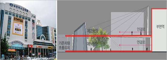 ¹®È­µµ½Ã ºÎõÀÇ °ü¹® ¿ªÇÒÀ» ÇÏ´Â ºÎõ¿ª ºÏºÎ±¤ÀåÀÌ ¿À´Â 2014³â±îÁö ±âÁ¸ÀÇ Â÷·® Á᫐ ±³Å뱤Àå¿¡¼­ º¸ÇàÀÚ Áß½ÉÀÇ 2Ãþ º¹ÃþÇü Æäµ¥½ºÆ®¸®¾È(Pedestrian¡¤º¸ÇàÀÚ) µ¥Å© ±¤ÀåÀ¸·Î Á¶¼ºµÈ´Ù.