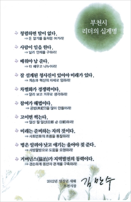 ±è¸¸¼ö ºÎõ½ÃÀåÀÌ 2011³âÀ» ¸¶¹«¸®ÇÏ´Â ½ÃÁ¡¿¡¼ °úÀå±Þ ÀÌ»ó °£ºÎ°ø¹«¿ø 110¸í¿¡°Ô ÇÑ ±ÇÀÇ Ã¥À» ¼±¹°Çß´Ù. ±è ½ÃÀåÀÌ ¼±¹°ÇÑ Ã¥Àº ·ù¶ûµµ ¾¾ÀÇ <Á¦´ë·Î ½ÃÄѶó>(½Ü¾ØÆÄÄ¿½º Æì³¿, 336ÂÊ) ÀÌ´Ù.