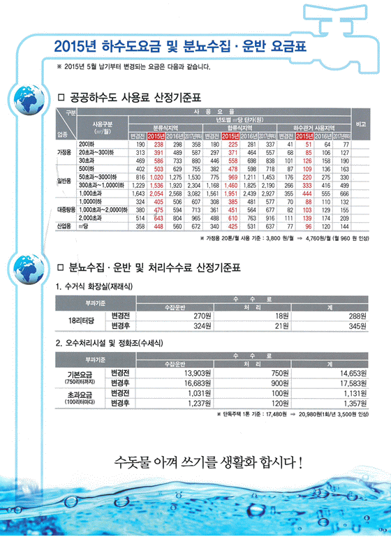 À̹ø¿¡ ÀλóµÇ´Â Çϼöµµ ¿ä±ÝÀÇ §©´ç ´Ü°¡´Â °¡Á¤¿ë ¿ù 20§© ÀÌÇÏ·Î »ç¿ëÇÒ °æ¿ì 190¿ø¿¡¼­ 238¿øÀ¸·Î, ¾÷¹«¿ëÀº ¿ù 50§© ÀÌÇÏ »ç¿ëÇÒ °æ¿ì 402¿ø¿¡¼­ 503¿øÀ¸·Î, ´ëÁßÅÁ¿ëÀº ¿ù 1000§© ÀÌÇÏ »ç¿ëÇÒ °æ¿ì 324¿ø¿¡¼­ 405¿øÀ¸·Î, »ê¾÷¿ëÀº §©´ç 358¿ø¿¡¼­ 448¿øÀ¸·Î °¢°¢ ÀλóµÇ¸ç, °¡Á¤¿ë ¿ù°£ 20Åæ »ç¿ë ½Ã ¿ä±ÝÀº ÇöÇà 3õ800¿ø¿¡¼­ 4õ760¿øÀ¸·Î ¿ù 960¿øÀÌ Ãß°¡ ºÎ´ãµÈ´Ù.