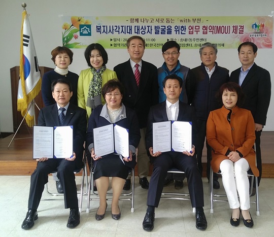 ºÎõ½Ã ¼Ò»ç±¸ ¼Û³»1µ¿ º¹ÁöÇùÀÇü(À§¿øÀå ±è¿µ±Ô)´Â Áö³­ 9ÀÏ µ¿ Áֹμ¾ÅÍ È¸Àǽǿ¡¼­ º¹Áö»ç°¢Áö´ë ´ë»óÀÚ ¹ß±¼À» À§ÇØ ³²ºÎõ¿ìü±¹(±¹Àå ±è³²½É), Çѱ¹Àü·Â°ø»ç ºÎõ°Ëħ¼¾ÅÍ(¼¾ÅÍÀå ÀÓ¿µ¼ö)¿Í ¾÷¹«Çù¾à(MOU)À» ü°áÇß´Ù.