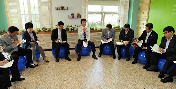 ½Ã´Â ÀÌ¿¡ µû¶ó 4ÀÏ ¿ÀÀü ºû¼Ò¸®¹æ¿¡¼ ¿¸° ½ÃÁ¤ ÃÖ°í Á¤Ã¥È¸ÀÇÀÎ ¡®Á¤Ã¥±âȹȸÀÇ¡¯¸¦ Å×ÀÌºí ¾ø´Â ¡®Áüº¼(Gym Ball)¡¯ ȸÀÇ·Î °³ÃÖÇß´Ù. Áüº¼Àº ¸öÀÇ ±ÕÇüÀ» ÀâÀ¸¸ç ½ºÆ®·¹Äª ÇÏ´Â Å« °ø ¸ð¾çÀÇ ¿îµ¿µµ±¸´Ù.