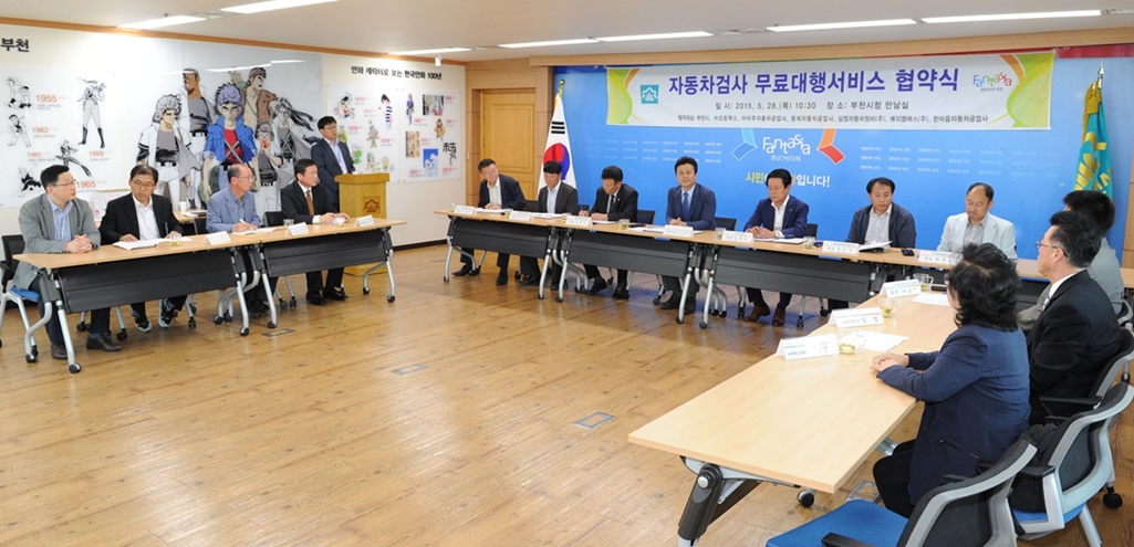 ±è¸¸¼ö ºÎõ½ÃÀå(¿ÞÂÊ¿¡¼­ 4¹øÂ°)ÀÌ 28ÀÏ ¿ÀÀü ¿­¸° ÀÚµ¿Â÷°Ë»ç ¹«·á ´ëÇ༭ºñ½º Çù¾à½Ä¿¡¼­ ±è´ë¼º ¢ß¿ÀÅ䏯½º ´ëÇ¥(¿À¸¥ÂÊ¿¡¼­ 4¹øÂ°) µî ºÎõ °ü³» 6°³ ÀÚµ¿Â÷Á¾ÇÕ°Ë»ç ÁöÁ¤ Á¤ºñ¾÷ü ´ëÇ¥µé°ú ±â³äÃÔ¿µÀ» Çϰí ÀÖ´Ù. <<ºÎõ½Ã Á¦°ø>>