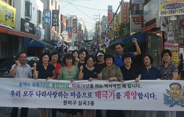 ºÎõ½Ã ¿ø¹Ì±¸ ½É°î3µ¿ Áֹμ¾ÅÍ(µ¿Àå ÀÌÇöÀÚ)´Â Á¦70Áֳ⠱¤º¹ÀýÀ» ¾ÕµÐ Áö³ 13ÀÏ µ¿Áֹμ¾ÅÍ¿¡¼ ºÎõ»ó°øÈ¸ÀǼұîÁö ¾à 500m ±¸°£À» ¡®Å±رâ ÈÖ³¯¸®´Â °Å¸®¡¯·Î ÁöÁ¤ÇØ ÅëÀå ¹× Áֹΰú ÇÔ²² ±¹±â ´Þ±â Ä·ÆäÀÎÀ» ¹ú¿´´Ù.
