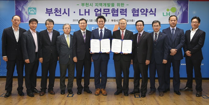 ±è¸¸¼ö ºÎõ½Ã½ÃÀå(¿ÞÂÊ)°ú ±Ç¼®¿ø LH ÀÎõÁö¿ªº»ºÎÀåÀÌ 15ÀÏ ¿ÀÀü ºÎõ½Ãû ¸¸³²½Ç¿¡¼ ºÎõ½Ã Áö¿ª°³¹ßÀ» À§ÇÑ ¾÷¹«Çù·Â Çù¾à½ÄÀ» °®°í ±â³äÃÔ¿µÀ» Çϰí ÀÖ´Ù. 2015.10.16. <<»çÁø= ºÎõ½Ã Á¦°ø>>