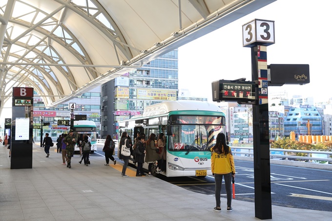2Ãþ ¹ö½º Àü¿ë ½Â°Àå¿¡¼ ³»¸®¸é ÀüöÀ» Ÿ±â À§ÇØ ¼öÆò À̵¿À» ÇÏ¸é µÈ´Ù. 1ÃþÀº ½Â¿ëÂ÷¤ýÅýà Àü¿ë ½Â°ÀåÀÌ´Ù. ±¤Àå ¾Õ¿¡´Â »ç¶÷ Áß½ÉÀÇ ¼ÒÅ뱤ÀåÀ¸·Î Å»¹Ù²ÞÇϱâ À§ÇÑ ¸·¹ÙÁö °ø»ç°¡ ÇÑâÀÌ´Ù. <<»çÁø= ºÎõ½Ã Á¦°ø>>