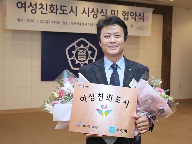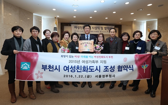 °ÀºÈñ ¿©¼º°¡Á·ºÎ Àå°ü°ú ±è¸¸¼ö ºÎõ½ÃÀåÀÌ 22ÀÏ ¿ÀÈÄ 2½Ã30ºÐ Á¤ºÎ¼¿ïû»ç ´ëȸÀǽǿ¡¼ ¡®¿©¼ºÄ£Èµµ½Ã Á¶¼º Çù¾à½Ä¡¯À» °®°í ±â³äÃÔ¿µÀ» Çϰí ÀÖ´Ù. 2016.1.22 <<»çÁø= ºÎõ½Ã Á¦°ø>>
