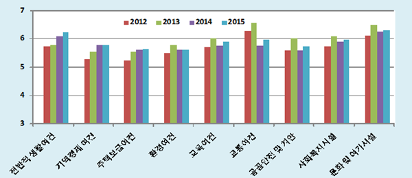 ¶Ç Áö¿ª°æÁ¦ ¿©°Ç(2012³â 5.30Á¡- 2013³â 5.53Á¡- 2014³â 5.79Á¡- 2015³â 5.80Á¡), ÁÖÅú¸±Þ ¿©°Ç(5.23Á¡- 5.54Á¡- 5.62Á¡- 5.64Á¡), ȯ°æ ¿©°Ç(5.50Á¡- 5.80Á¡- 5.62Á¡- 5.63Á¡), ±³À° ¿©°Ç(5.73Á¡- 6.04Á¡- 5.76Á¡- 5.91Á¡), ±³Åë ¿©°Ç(6.27Á¡- 6.57Á¡- 5.76Á¡- 5.96Á¡), °ø°ø¾ÈÀü ¹× Ä¡¾È(5.60Á¡- 6.03Á¡- 5.60Á¡- 5.74Á¡), »çȸº¹Áö½Ã¼³(5.74Á¡- 6.09Á¡- 5.92Á¡- 5.97Á¡), ¹®È­ ¹× ¿©°¡½Ã¼³(6.11Á¡- 6.49Á¡- 6.25Á¡- 6.30Á¡) µî À̾ú´Ù.