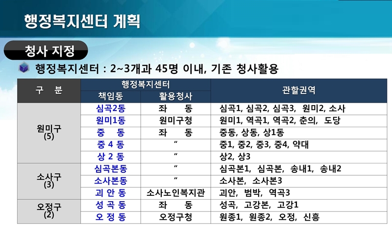 ºÎõ½Ã°¡ ¿À´Â 7¿ùºÎÅÍ ÀÏ¹Ý ±¸(Ï¡) ¿ø¹Ì¤ý¼Ò»ç¤ý¿ÀÁ¤±¸Ã»À» ÆóÁöÇϰí, 36°³ µ¿À» 10°³ÀÇ ±Ç¿ªÀ¸·Î ³ª´² ±¤¿ª(Ã¥ÀÓ)µ¿ÀÎ ¡®ÇàÁ¤º¹Áö¼¾ÅÍ¡¯·Î ÀüȯÇÏ´Â ÇàÁ¤Ã¼Á¦ °³ÆíÀÛ¾÷À» ÃßÁøÇϰí ÀÖ´Ù.