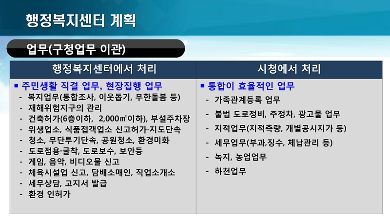 ÀÌ¿¡ µû¶ó ±¸Ã»(¾ÈÀü°ü¸®, ȯ°æ, û¼Ò, °ÇÃà, µµ·Î Á¡¿ë µî), µ¿(¹Î¿ø, º¹Áö, ¹Î¹æÀ§, ÁÖ¹ÎÀÚÄ¡ µî)¿¡¼­ ¸Ã´ø ¾÷¹«¸¦ ÇàÁ¤º¹Áö¼¾ÅÍ¿¡¼­ ¸Ã°Ô µÈ´Ù.