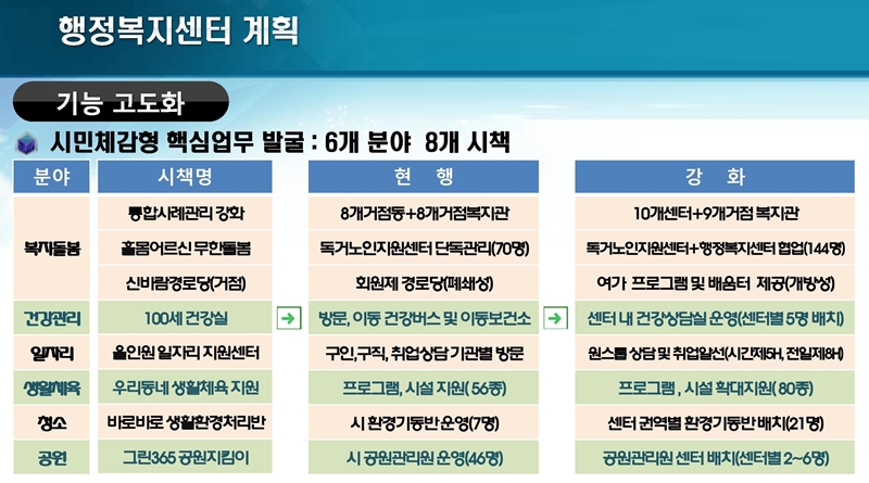 ¶Ç °ÅÁ¡È­ Àü·«(ã¾Æ°¡´Â ÇàÁ¤º¹Áö¼¾ÅÍ, ½Å¹Ù¶÷ °æ·Î´ç)¤ý°ü°è±â°ü ³×Æ®¿öÅ© Çãºê ¹× ÄÁÆ®·Ñ Ÿ¿ö Àü·«(Ȧ¸ö ¾î¸£½Å ¹«ÇÑ µ¹º½, ¿ÃÀοø ÀÏÀÚ¸® Áö¿ø¼¾ÅÍ)¤ý±âÁ¸ »ç¾÷ÀÇ ÁֹΠÁ¢±Ù¼º ¹× º¸Æí¼º °­È­ Àü·«(½Å¹Ù¶÷ °æ·Î´ç, Áֹΰú ÇÔ²²ÇÏ´Â ¡®100¼¼ °Ç°­½Ç¡¯, ¿ì¸®µ¿³× üÀ°È°µ¿ Áö¿ø)¤ýÇöÀåÁ᫐ Àη¹èÄ¡¸¦ ÇÑ Ã¥ÀÓ¼º °­È­ Àü·«( ¹Ù·Î¹Ù·Î ¡®»ýȰȯ°æÁ¤ºñ¹Ý(°¡Äª)¡¯ ¿î¿µ, ±×¸° 365 °ø¿ø ÁöÅ´ÀÌ) µîÀ¸·Î ³ª´² ÃßÁøÇÒ °ÍÀ» ÁÖ¹®Çß´Ù.
