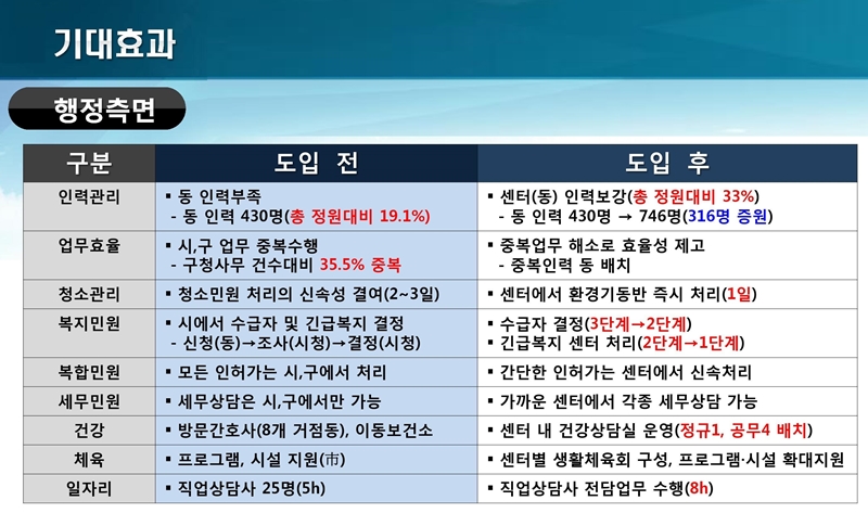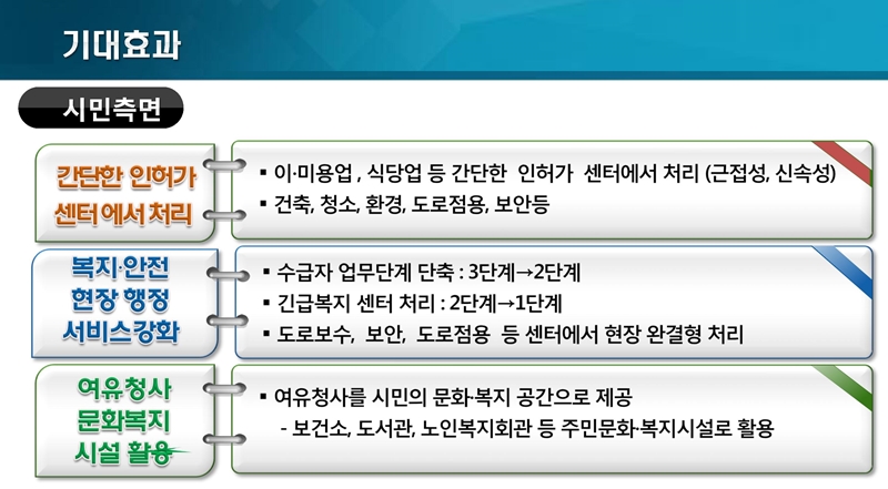 º¹Áö¤ý¾ÈÀü µî ÇöÀå ÇàÁ¤ ¼­ºñ½º°¡ °­È­µÈ´Ù. ¼ö±ÞÀÚ ¾÷¹« ´Ü°è°¡ 3´Ü°è¿¡¼­ 2´Ü°è·Î ´ÜÃàµÇ°í, ±ä±Þ º¹Áö¾÷¹«µµ 2´Ü°è¿¡¼­ 1´Ü°è·Î ´ÜÃàµÇ¸ç, µµ·Î º¸¼ö¤ýº¸¾È¤ýµµ·Î Á¡¿ë µîÀ» ÇàÁ¤º¹Áö¼¾ÅÍ¿¡¼­ ÇöÀå ¿Ï°áÇüÀ¸·Î ó¸®ÇÏ°Ô µÈ´Ù.