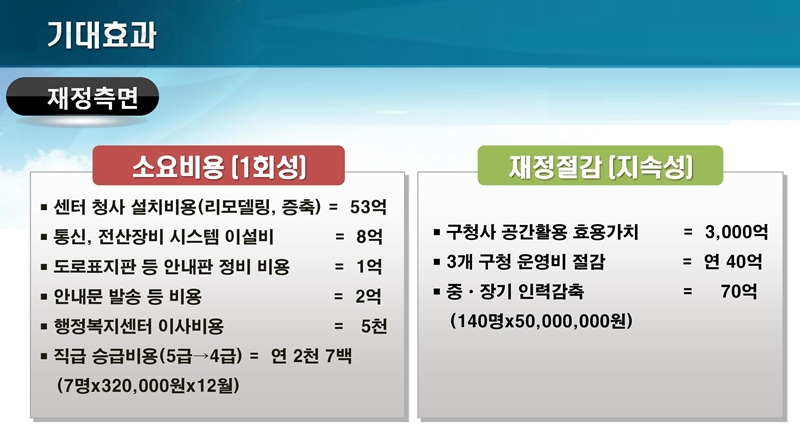 ¹Ý¸é¿¡ ÇàÁ¤º¹Áö¼¾ÅÍ Àüȯ¿¡ µû¸¥ ÀçÁ¤ Àý°¨(Áö¼Ó¼º)Àº ±¸Ã»»ç °ø°£ Ȱ¿ë È¿¿ë °¡Ä¡ 3õ¾ï¿ø, 3°³ ±¸Ã» ¿î¿µºñ Àý°¨ ¿¬ 40¾ï¿ø, ÁߤýÀå±â Àη °¨Ãà 70¾ï¿ø(146¸í¡¿5õ¸¸¿ø) µîÀ¸·Î ³»´Ùº¸°í ÀÖ´Ù.