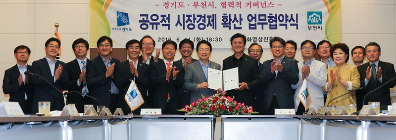 ³²°æÇÊ °æ±âµµÁö»ç(¿ÞÂÊ)¿Í ±è¸¸¼ö ºÎõ½ÃÀå(¿À¸¥ÂÊ)ÀÌ 14ÀÏ ¿ÀÈÄ ºÎõ½Ã »ó3µ¿ ¼ÒÀç Çѱ¹¸¸È­¿µ»óÁøÈï¿ø 5Ãþ ¼¼¹Ì³ª½Ç¿¡¼­ ¡®°æ±âµµ-ºÎõ½Ã °øÀ¯Àû ½ÃÀå°æÁ¦ È®»ê Çù¾à¡¯À» ü°áÇÏ°í ±â³äÃÔ¿µÀ» Çϰí ÀÖ´Ù. 2016.6.14 »çÁø= °æ±âµµÃ» Á¦°ø