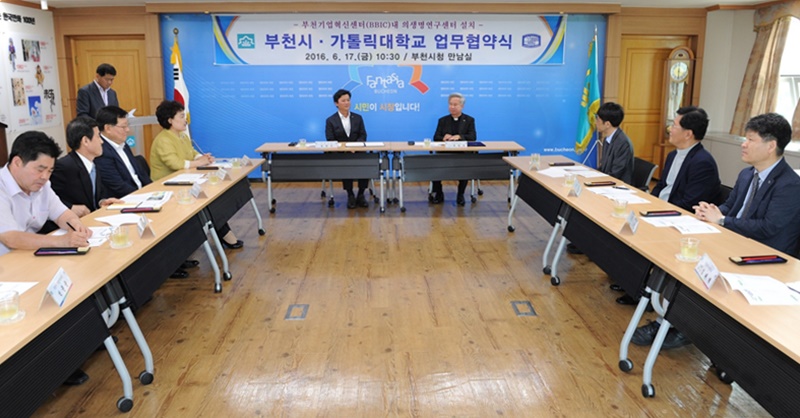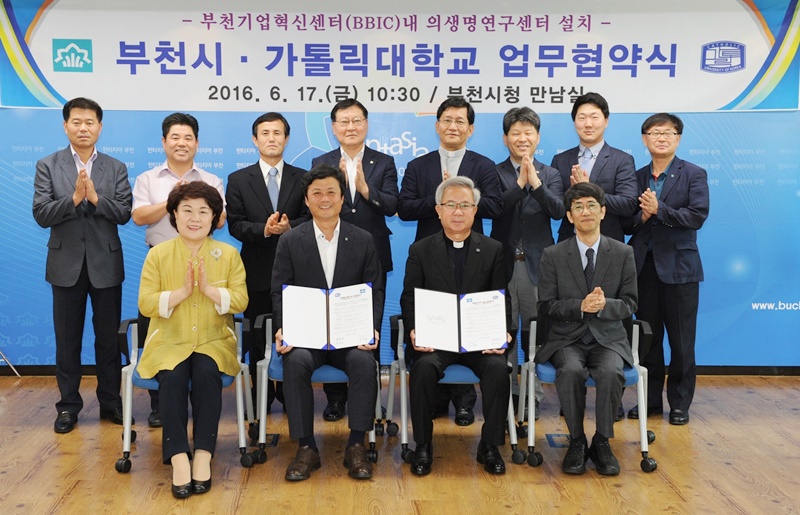 ±è¸¸¼ö ºÎõ½ÃÀå°ú ¹Ú¿µ½Ä °¡Å縯´ëÇб³ ÃÑÀå(¿ÞÂʺÎÅÍ)ÀÌ 17ÀÏ ¿ÀÀü 10½Ã30ºÐ ½Ãû ¸¸³²½Ç¿¡¼­ ºÎõ ¿µ»ó¹®È­»ê¾÷´ÜÁö ³» °Ç¸³µÉ ¿¹Á¤ÀÎ ºÎõ±â¾÷Çõ½Å¼¾ÅÍ(BBIC)¿¡ ¡®ÀÇ»ý¸í¿¬±¸¼¾ÅÍ¡¯ ¼³Ä¡¸¦ À§ÇÑ ¾÷¹«Çù¾àÀ» ü°áÇÏ°í ±â³äÃÔ¿µÀ» Çϰí ÀÖ´Ù. 2016.6.17