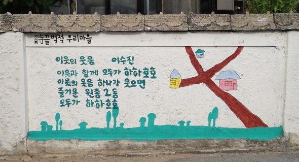 ¿øÁ¾2µ¿ °ñ¸ñ±æ ´ãÀå¿¡´Â ÇлýÀÇ ½ÃÈ­ÀÛǰÀÌ ±×·ÁÁ® ÀÖ´Ù. ¡®ÀÌ¿ô°ú ÇÔ²² ¸ðµÎ°¡ ÇÏÇÏȣȣ/ ÀÌ¿ôÀÇ ¿ôÀ½ Çϳª°¡ ¿ôÀ¸¸é/ Áñ°Å¿î ¿øÁ¾2µ¿/ ¸ðµÎ°¡ ÇÏÇÏȣȣ¡¯. À̼öÁø ¾çÀÇ ¡®ÀÌ¿ôÀÇ ¿ôÀ½¡¯À̶õ ½ÃÈ­ÀÛǰÀ¸·Î, °ñ¸ñ±æ¿¡ »ý±â¸¦ µ¹°Ô Çϰí ÀÖ´Ù.