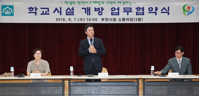 7ÀÏ ¿ÀÈÄ 2½Ã ºÎõ½Ãû ¼ÒÅ븶´ç¿¡¼­ ¿­¸° ¡®Çб³½Ã¼³ °³¹æ ¾÷¹«Çù¾à½Ä¡¯¿¡¼­ Á¶¿µ¼÷ ºÎõ±³À°Áö¿øÃ» ±³À°Àå, ±èÁ¾±Ù ºÎõ½ÅÈïÃʵîÇб³Àå, ±è¸¸¼ö ºÎõ½ÃÀå(¿ÞÂʺÎÅÍ)ÀÌ ±â³äÃÔ¿µÀ» Çϰí ÀÖ´Ù.