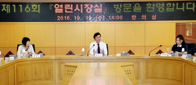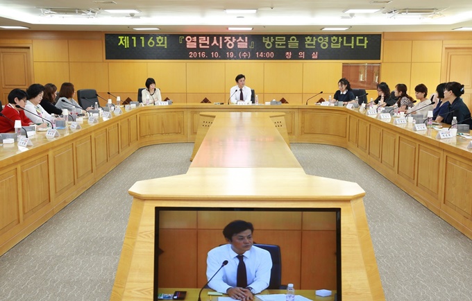 ÇÑÆí, Áö³ 2013³â 6¿ùºÎÅÍ ½ÃÀÛÇÑ ¡®¿¸° ½ÃÀå½Ç¡¯Àº ½ÃÀå°ú ½Ã¹ÎÀÌ Á÷Á¢ ¸¸³ª ´ëÈÇÏ°í ½ÃÀå Áý¹«½ÇÀ» Æ÷ÇÔÇÑ Ã»»ç ÁÖ¿ä½Ã¼³À» µÑ·¯º¸´Â ¹æ½ÄÀ¸·Î, ¸ÅÁÖ ¼ö¿äÀÏ ¿ÀÈÄ 2½ÃºÎÅÍ 5½Ã±îÁö ÁøÇàµÇ¸ç, Áö±Ý±îÁö 116ȸ¿¡ °ÉÃÄ ¿î¿µµÅ ½Ã¹Î 3õ¸íÀÌ Âü¿©Çß´Ù.