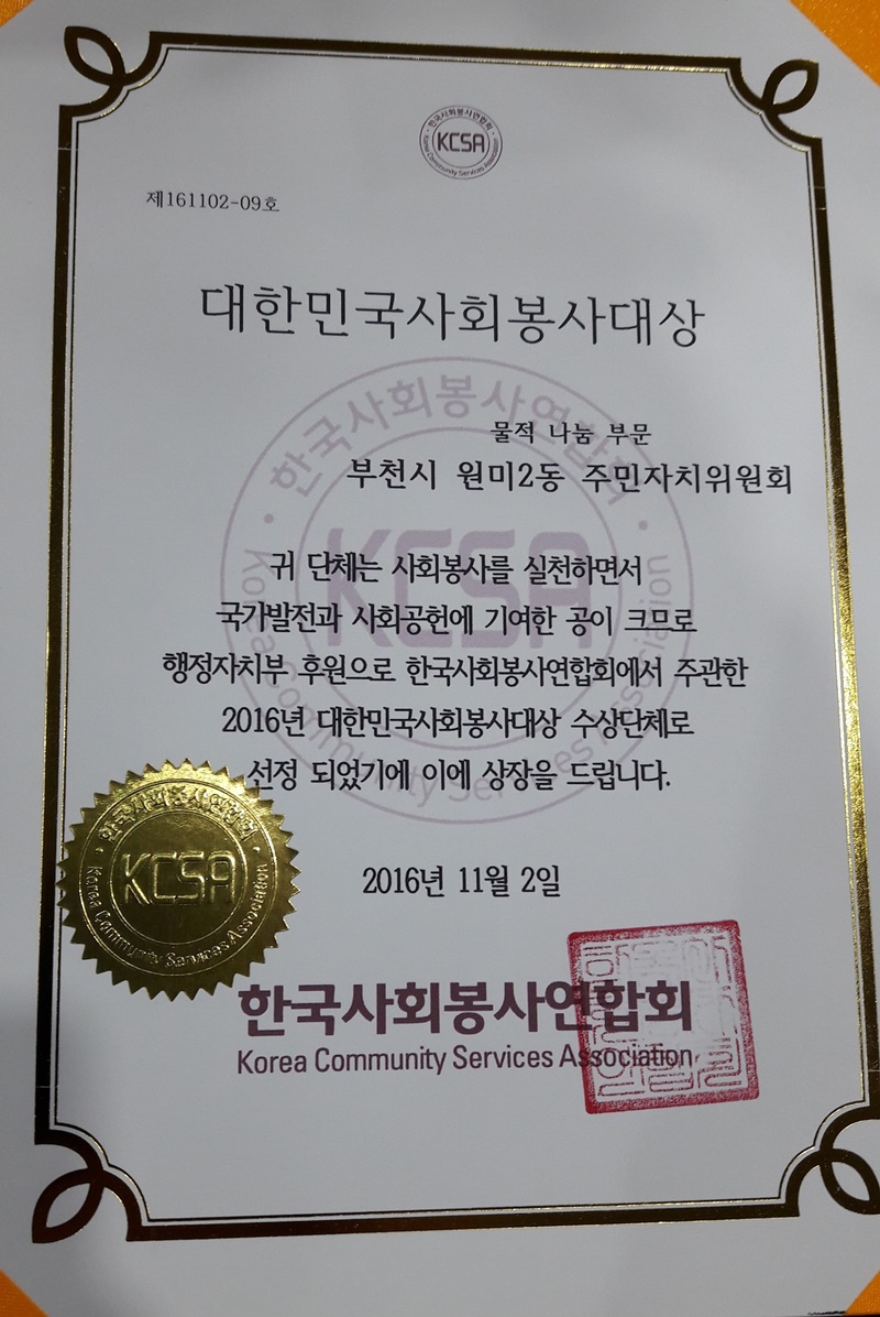 ºÎõ½Ã ¿ø¹Ì2µ¿ ÁÖ¹ÎÀÚÄ¡À§¿øÈ¸(À§¿øÀå ¼ÁÖ¾Æ)´Â Áö³ 2ÀÏ ÇàÁ¤ÀÚÄ¡ºÎ°¡ ÈÄ¿øÇϰí Çѱ¹»çȸºÀ»ç¿¬ÇÕȸ°¡ ÁÖÃÖÇÑ ´ëÇѹα¹ »çȸºÀ»ç´ë»ó ¹°Àû³ª´® ºÐ¾ß¿¡¼ ´Üü»óÀ» ¹Þ¾Ò´Ù.