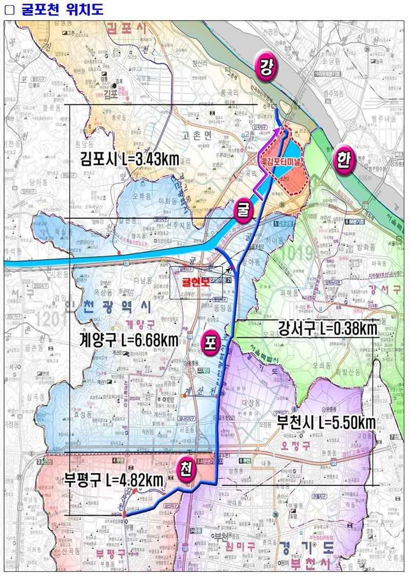 ±¼Æ÷õÀº ÀÎõ½Ã ºÎÆò±¸ ûÀüµ¿¿¡¼­ ±èÆ÷½Ã °íÃ̵¿ ÇѰ­ ÇÕ·ùÁ¡±îÁö ÃÑ¿¬Àå 15.31km(ÇÏõ Æø 23~100m, ¼ö½É 1.0~6,25m) ±¸°£¿¡ 3°³ ±¤¿ª½Ã¿Í 5°³ ±âÃÊÀÚÄ¡´Üü¸¦ °ü·ùÇÏ´Â Áö¹æÇÏõÀÌ´Ù.