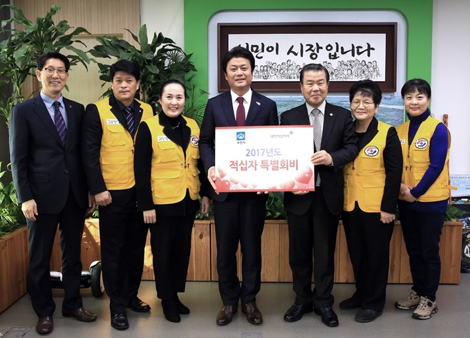 ±è¸¸¼ö ºÎõ½ÃÀå(¿ÞÂÊ)ÀÌ 20ÀÏ ±èÈÆµ¿ ´ëÇÑÀû½ÊÀÚ»ç °æ±âµµÁö»ç ȸÀå(¿À¸¥ÂÊ)¿¡°Ô 2017³âµµ Àû½ÊÀÚ Æ¯º°È¸ºñ 100¸¸¿øÀ» Àü´ÞÇÏ°í ±â³äÃÔ¿µÀ» Çϰí ÀÖ´Ù. 2017.1.20