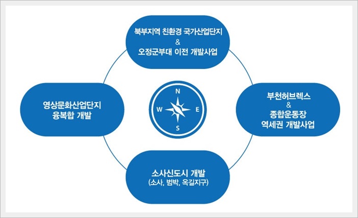 Áï, ¡ãµ¿ÂÊ Áö¿ªÀº ºÎõÇãºê·º½º ¹× Á¾ÇտÀå ¿ª¼¼±Ç °³¹ß»ç¾÷, ¡ã¼ÂÊ Áö¿ªÀº ºÎõ¿µ»ó¹®È»ê¾÷´ÜÁö À¶º¹ÇÕ °³¹ß ¡ã³²ÂÊ Áö¿ªÀº ¼Ò»ç½Åµµ½Ã(¼Ò»ç, ¹ü¹Ú, ¿Á±æÁö±¸) °³¹ß ¡ãºÏÂÊ Áö¿ªÀº ºÏºÎÁö¿ª ģȯ°æ ±¹°¡»ê¾÷´ÜÁö ¹× ¿ÀÁ¤µ¿ ±ººÎ´ë ÀÌÀü °³¹ß»ç¾÷À» ÃßÁøÇÒ °èȹÀÌ´Ù.