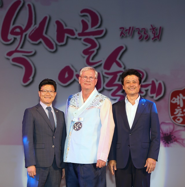 ±è¸¸¼ö ºÎõ½ÃÀå(¿À¸¥ÂÊ)°ú °­µ¿±¸ ºÎõ½ÃÀÇȸ ÀÇÀå(¿ÞÂÊ)ÀÌ 4ÀÏ ¿ÀÈÄ 7½Ã30ºÐºÎÅÍ ºÎõ½Ãû Àܵð±¤Àå Æ¯¼³¹«´ë¿¡¼­ ¿­¸° Á¦33ȸ º¹»ç°ñ¿¹¼úÁ¦ °³¸·½Ä¿¡¼­ ¹Ì±¹ º£ÀÌÄ¿Çʽº½Ã ÄË À§¾î(Ken Weir) ÀÇ¿ø(°¡¿îµ¥)¿¡°Ô ºÎõ½Ã ¸í¿¹½Ã¹ÎÁõ°ú ±â³ä ¹èÁö¸¦ ´Þ¾ÆÁÖ°í ±â³ä»çÁøÀ» Âï°í ÀÖ´Ù.