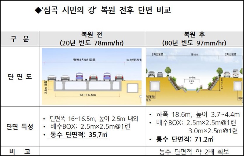 32³â ¸¸¿¡ »ýÅÂÇÏõÀ¸·Î º¹¿øµÅ Áö³­ 5¿ù5ÀÏ ½Ã¹Î¿¡ °³¹æµÈ ¡®½É°î ½Ã¹ÎÀÇ °­(½É°îõ)¡¯Àº ÁÖº¯Áö¿ªÀÇ »ó½ÀÀûÀΠħ¼öÇÇÇØ ¿¹¹æÀ» À§ÇØ ½Ã°£´ç 97mm(80³â ºóµµ)±îÁö °ßµô ¼ö ÀÖµµ·Ï ¼³°èµÆÀ¸¸ç, ÀÌ´Â º¹¿ø Àü 78.3mm(20³â ºóµµ)¿¡ ºñÇØ ¾à 2¹è °¡·® Åë¼ö´Ü¸éÀ» È®´ë(35§³¡æ71§³) Á¶¼ºÇß´Ù.