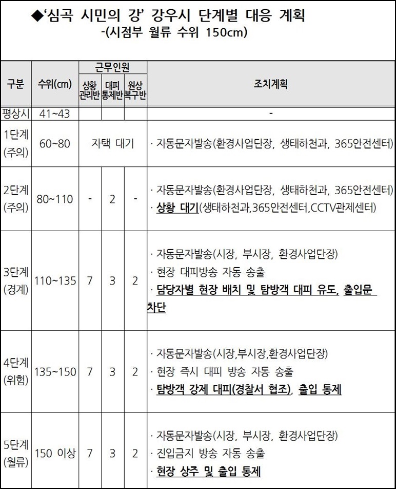 ½É°îõ¿¡ °©ÀÛ½º·± Æø¿ì½Ã ½Ã¹Î ´ëÇÇ¿Í ¾ÈÀü´ëÃ¥°ú °ü·ÃÇØ¼­´Â ¡°ÇÏõ °æ°è ¼öÀ§ µµ´Þ½Ã ÀÚµ¿°æº¸ ¹æ¼ÛÀÌ °¡´ÉÇϵµ·Ï Àç³­¿¹°æº¸½Ã½ºÅÛÀ» ±¸ÃàÇØ ½É°îõ ¼öÀ§ º¯È­¿¡ µû¶ó »çÀü ´ëÇÇ ¾È³»¹æ¼Û, °ü°èÀÚ ¹®ÀÚ ¹ß¼Û, ÁøÀÔ±ÝÁö ´ëÇǹæ¼Û µîÀ» ÀÚµ¿ ¼ÛÃâÇϵµ·Ï °ü¸®Çϰí ÀÖ´Ù¡±¸ç ¡°»ýÅÂÇÏõ°ú »óȲ½Ç°ú CCTVÅëÇÕ°üÁ¦¼¾ÅÍ¿¡¼­ ½É°îõ¿¡ ¼³Ä¡µÈ 7´ëÀÇ CCTV¸¦ 24½Ã°£ ¸ð´ÏÅ͸µÇϸ鼭 °æº¸¹æ¼ÛÀ» ÅëÇÑ ½Ç½Ã°£ ´ëÇÇ ¾È³»¹æ¼Û ½Ç½Ã¿Í ħ¼ö ¿ì·Á½Ã ÃâÀԽü³ 9°÷ ÅëÁ¦¿Í ¼ö½Ã ÇöÀå¼øÂûÀ» °­È­ÇØ ÀθíÇÇÇØ°¡ ¾øµµ·Ï °ü¸®Çϰí ÀÖ´Ù¡±°í ¸»Çß´Ù.