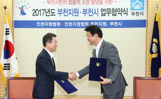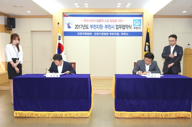±è¸¸¼ö ºÎõ½ÃÀå(¿À¸¥ÂÊ)°ú ±è¼öÀÏ ÀÎõÁö¹æ¹ý¿ø ºÎõÁö¿øÀå(¿ÞÂÊ)ÀÌ 29ÀÏ ºÎõ½Ã¹ÎÀÇ ¹ý·üÀû ¼Ò¾ç ÇÔ¾çÀ» À§ÇÑ ¾÷¹«Çù¾àÀ» ü°áÇÏ°í ±â³äÃÔ¿µÀ» Çϰí ÀÖ´Ù.