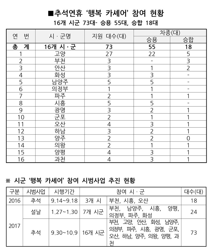 ÀÌ¿¡ µû¶ó À̹ø Ãß¼®¿¬ÈÞ¿¡´Â °æ±âµµ Â÷·® 105´ë¸¦ Æ÷ÇÔÇØ ÃÑ 178´ëÀÇ °ø¿ëÂ÷·®ÀÌ Á¦°øµÉ ¿¹Á¤ÀÌ¾î¼ ¿¬ÈޱⰣ ¿ª´ë ÃÖ´ë ±Ô¸ðÀÇ ¡®Çູ Ä«¼Î¾î¡¯°¡ ¿îÇàµÈ´Ù.