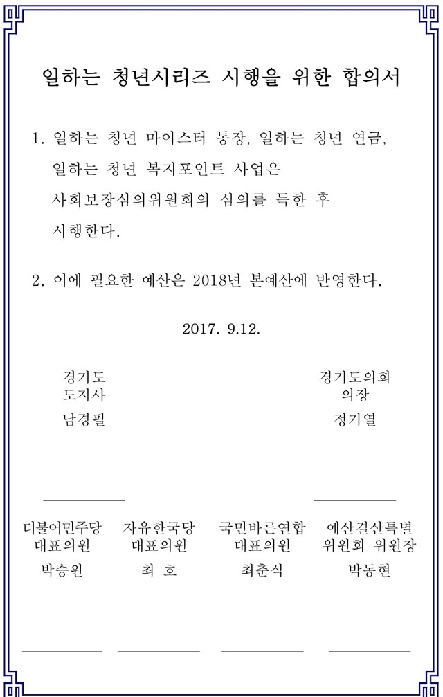 ³²°æÇÊ °æ±âµµÁö»ç¿Í Á¤±â¿­ °æ±âµµÀÇȸ ÀÇÀå, ¹Ú½Â¿ø ´õºÒ¾î¹ÎÁÖ´ç ´ëÇ¥ÀÇ¿ø, ÃÖÈ£ ÀÚÀ¯Çѱ¹´ç ´ëÇ¥ÀÇ¿ø, ÃÖÃá½Ä ±¹¹Î¹Ù¸¥¿¬ÇÕ ´ëÇ¥ÀÇ¿ø, ¹Úµ¿Çö ¿¹»ê°á»êƯº°À§¿øÀåÀº 12ÀÏ ¿ÀÈÄ À̰°Àº ³»¿ëÀ» ´ãÀº ¡®ÀÏÇϴ û³â½Ã¸®Áî ½ÃÇàÀ» À§ÇÑ ÇÕÀǼ­¡¯¿¡ ¼­¸íÇß´Ù.