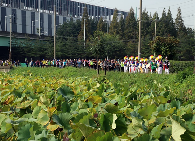 º°¡ À;´Â ¡®´ëÀå Ȳ±Ýµé³è °È±â¡¯¿¡´Â 700¿© ¸íÀÇ ÁֹεéÀÌ Âü¿©ÇÑ °¡¿îµ¥ ³ó¾Ç´ë¸¦ ¾Õ¼¼¿ì°í Ãâ¹ßÇßÀ¸¸ç, ´ö»ê°íµîÇб³¿¡¼´Â ¼ÛÁ¾±Ô ±³ÀåÀ» ºñ·ÔÇØ ÀÎ¼Ö ±³»ç, Çлý µî 50¿© ¸íÀÌ ±ê¹ß°ú Àú¸¶´Ù Ư»ö ÀÖ´Â º¹ÀåÀ¸·Î Âü¿©ÇØ ´«±æÀ» ²ø¾úÀ¸¸ç, Âü°¡ ÁֹεéÀº ¹Ù¶÷°³ºñ¸¦ ¼Õ¿¡ µé°í °¡À» µé³èÀ» ÇàÁøÇß´Ù.