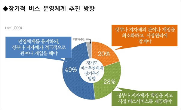 ¶ÇÇÑ Àå±âÀûÀÎ °æ±âµµÀÇ ¹ö½ºÃ¼°è ¿î¿µ¹æ½Ä¿¡ ´ëÇØ¼´Â 49%°¡ ¡®¹Î¿µÃ¼Á¦¸¦ À¯ÁöÇϵÇ, Á¤ºÎ³ª ÁöÀÚü°¡ Àû±ØÀûÀ¸·Î °³ÀÔÇÏ´Â Áذø¿µ ¹æ½Ä¡¯À» ²Å¾Ò°í, 20%´Â ¡®½ÃÀå¿ø¸®¿¡ ¸Ã°Ü¾ß ÇÑ´Ù¡¯(¿ÏÀü ¹Î¿µ), 28%´Â ¡®ÁöÀÚü°¡ Á÷Á¢ ¹ö½º¼ºñ½º¸¦ Á¦°øÇØ¾ß ÇÑ´Ù¡¯(¿ÏÀü °ø¿µ) ¼øÀ¸·Î Á¶»çµÆ´Ù.