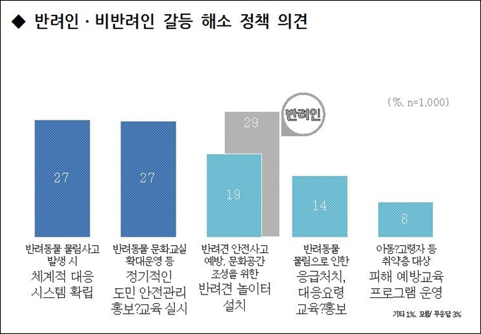 ¹Ý·ÁÀΰú ºñ¹Ý·ÁÀÎÀÇ °¥µî ÇØ¼Ò¸¦ À§ÇÑ Á¤Ã¥À¸·Î´Â ¡®¹°¸²»ç°í ¹ß»ý½Ã ü°èÀû ´ëÀÀ½Ã½ºÅÛ È®¸³¡¯°ú ¡®¹Ý·Áµ¿¹° ¹®È­±³½Ç µî Á¤±âÀûÀÎ µµ¹Î ¾ÈÀü°ü¸® È«º¸¡¤±³À° ½Ç½Ã¡¯°¡ °¢°¢ 27%·Î ³ªÅ¸³µ°í, 19%´Â ¡®¹Ý·Á°ß ³îÀÌÅÍ ¼³Ä¡¡¯¸¦ ²Å¾Ò´Ù. º¯·ÁÀÎ 290%µµ ¹Ý·Á°ß ³îÀÌÅÍ ¼³Ä¡ Çʿ伺À» ²Å¾Ò´Ù.