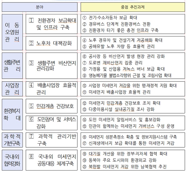 µµ°¡ ¸¶·ÃÇÑ ¹Ì¼¼¸ÕÁö Àú°¨ Á¾ÇÕ´ëÃ¥Àº ¡ãÀ̵¿ ¿À¿°¿ø °ü¸®°È¸¦ ÅëÇÑ ¹Ì¼¼¸ÕÁö ±Ùº»Àû Àú°¨ ¡ã»ýȰ ÁÖº¯ ¹Ì¼¼¸ÕÁö ¹ß»ý¿ø ÁýÁß°ü¸® ¡ã»ç¾÷Àå ¹èÃâ½Ã¼³ °ü¸® ¼±ÁøÈ¸¦ ÅëÇÑ ¹Ì¼¼¸ÕÁö °¨Ãà ¡ã¹Î°¨°èÃþ Á᫐ ¸ÂÃãÇü ȯ°æº¹Áö»ç¾÷ È®´ë ¡ã°úÇÐÀû °ü¸®±â¹Ý ±¸ÃàÀ» ÅëÇÑ ¹Ì¼¼¸ÕÁö ´ëÀÀ¿ª·® °È ¡ã±¹³»¿Ü Çù·Â°È·Î ´ë±âÁú °³¼± µî ¡®6´ë ÃßÁø Àü·«¡¯À» ¼ö¸³, ºÐ¾ßº°·Î ÃÑ 20°³ ÁßÁ¡ °úÁ¦¸¦ ¼±Á¤, ÃßÁøÇØ ³ª°£´Ù´Â °èȹÀÌ´Ù.