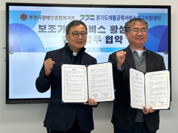 ºÎõ½ÃÀå¾ÖÀÎÁ¾ÇÕº¹Áö°ü(°üÀå ÀÌÈ¿¹Î)°ú °æ±âµµÀçȰ°øÇм­ºñ½º¿¬±¸Áö¿ø¼¾ÅÍ(¼¾ÅÍÀå °­ÀÎÇÐ)´Â Áö³­ 1¿ù 30ÀÏ Àå¾ÖÀÎÀ» À§ÇÑ º¸Á¶±â±â ÅëÇÕÁö¿ø¼­ºñ½º ü°è ±¸ÃàÀ» ¸ñÀûÀ¸·Î ¾÷¹«Çù¾à(MOU)À» ü°áÇß´Ù.