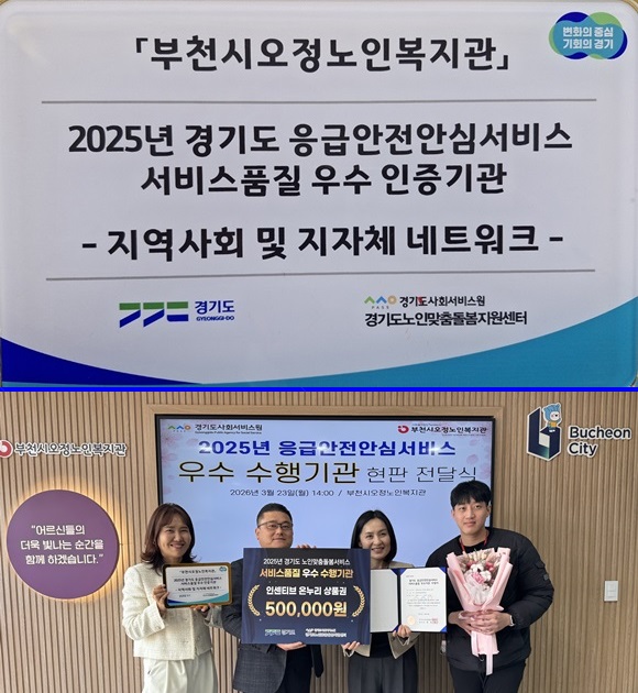 ºÎõ½Ã ¿ÀÁ¤±¸ ¼Ò»ç·Î669¹ø±æ 10(¿©¿ùµ¿ 10-46) ¼ÒÀç ºÎõ½Ã¿ÀÁ¤³ëÀκ¹Áö°ü(°üÀå Ȳ¼º¾Ö)Àº Áö³­ 23ÀÏ ¡®ÀÀ±Þ¾ÈÀü¾È½É¼­ºñ½º ¼­ºñ½ºÇ°Áú ¿ì¼ö ¼öÇà±â°ü ¼±Á¤¡¯À» ±â³äÇÏ´Â ÇöÆÇ Àü´Þ½ÄÀ» °³ÃÖÇß´Ù.