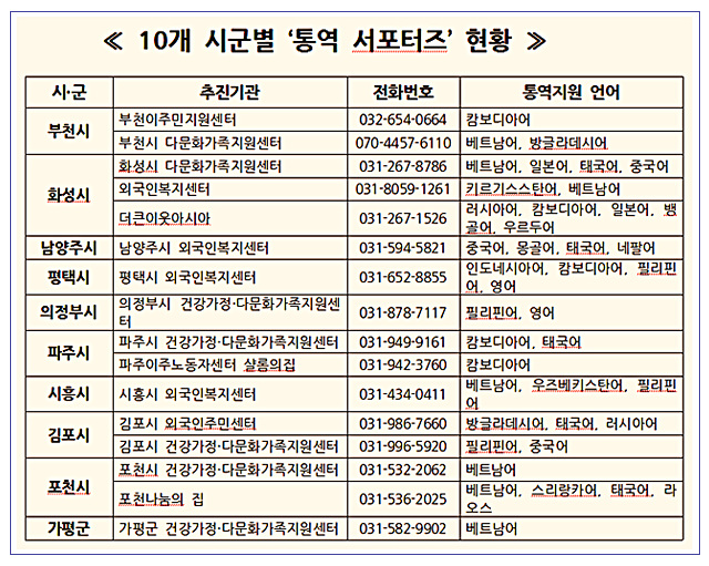 ÇöÀç ºÎõ½Ã, ȼº½Ã, ³²¾çÁÖ½Ã, ÆòÅýÃ, ÀÇÁ¤ºÎ½Ã, ÆÄÁÖ½Ã, ½ÃÈï½Ã, ±èÆ÷½Ã, Æ÷õ½Ã, °¡Æò±º µî 10°³ ½Ã¡¤±º¿¡¼ ¿µ¾î, Áß±¹¾î, º£Æ®³²¾î µî 17°³ ¾ð¾îÀÇ 45¸íÀ» ¡®¼Æ÷ÅÍÁ·Î ÀÓ¸íÇØ Ȱµ¿Çϰí ÀÖ´Ù.