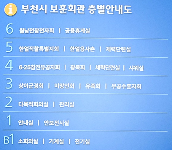ºÎõ½Ã º¸ÈÆÈ¸°üÀº ÁöÇÏ 1Ãþ ¼ÒȸÀǽÇ, 1Ãþ ¾Èº¸Àü½Ã½Ç, 2Ãþ ´Ù¸ñÀûȸÀǽǤý°ü¸®½Ç, 3Ãþ »óÀ̱º°æÈ¸¤ý¹Ì¸ÁÀÎȸ¤ýÀ¯Á·È¸¤ý¹«°ø¼öÈÆÀÚȸ, 4Ãþ 6.25ÂüÀüÀ¯°øÀÚȸ¤ý±¤º¹È¸¤ýä·Â´Ü·Ã½Ç¤ý»þ¿ö½Ç, 5Ãþ ÇѾóÁ÷ÇÒÆ¯º°Áöȸ¤ýÇѾó¿ë»çÃ̤ýü·Â´Ü·Ã½Ç, 6Ãþ ¿ù³²ÀüÂüÀüÀÚȸ¤ý°ø¿ëÈÞ°Ô½Ç µîÀÌ µé¾î¼­ ÀÖ´Ù.