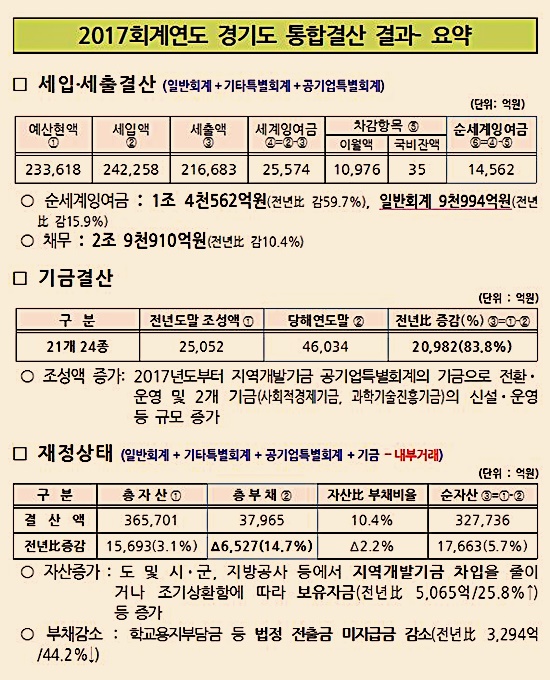 24ÀÏ °æ±âµµ 2017ȸ°è¿¬µµ °á»ê °á°ú¿¡ µû¸£¸é °æ±âµµÀÇ Áö³ÇØ ÀÚ»ê ´ëºñ ºÎäÀ²Àº 10.4%·Î 2016³â 12.6% ´ëºñ 2.2% °¨¼ÒÇß´Ù. ÀÌ´Â ÀÚ»êÀº Àü³â ´ëºñ 3.1% Áõ°¡ÇÑ ´ë½Å ºÎä´Â Àü³â ´ëºñ 14.7% °¨¼ÒÇÑ µ¥ µû¸¥ °ÍÀÌ´Ù.