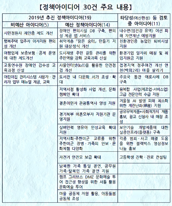 7ÀÏ °æ±âµµ¿¡ µû¸£¸é µµ´Â Áö³ÇØ 8~10¿ù±îÁö Á¤Ã¥ ¼öÇýÀÚ¸¦ ´ë»óÀ¸·Î °£´ãȸ¸¦ ÅëÇØ ¼öÁýÇÑ ÃÑ 58°ÇÀÇ Á¤Ã¥¾ÆÀ̵ð¾î °¡¿îµ¥ ¿ì¼± ½ÃÇàÀÌ °¡´ÉÇϰųª Ÿ´ç¼º °ËÅä°¡ ÇÊ¿äÇÑ 30°ÇÀ» äÅÃÇß´Ù.