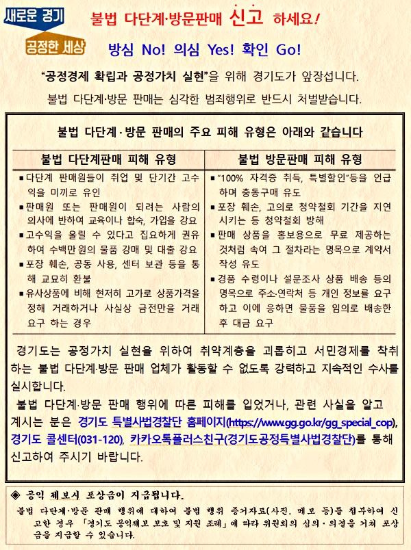 19ÀÏ °æ±âµµ¿¡ µû¸£¸é µµ´Â Áö³ÇØ 10¿ù ¡®°øÁ¤Æ¯º°»ç¹ý°æÂû´Ü¡¯À» Ãâ¹üÇÏ°í ºÒ¹ý ´Ù´Ü°è ÆÇ¸Å ÇàÀ§³ª ¹æ¹® ÆÇ¸Å¿¡ ´ëÇÑ ÁýÁß¼ö»ç¸¦ ÆîÄ¡°í ÀÖ´Ù.