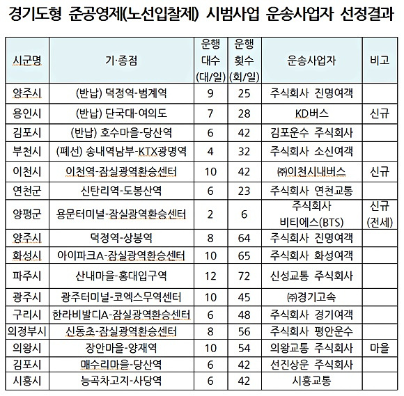 °æ±âµµ´Â 2±â ½Åµµ½Ã, Áß¼ÒÅÃÁöÁö±¸, ±³Åë ¼Ò¿ÜÁö¿ª µî 14°³ ½Ã¤ý±ºÀ» ´ë»óÀ¸·Î ¿îÇàµÉ ³ë¼±ÀÔÂûÁ¦ ±â¹Ý ¡®°æ±âµµÇü ¹ö½ºÁذø¿µÁ¦¡¯ ½Ã¹ü»ç¾÷ 16°³ ³ë¼±(120´ë)ÀÇ ¿î¼Û»ç¾÷ÀÚ¸¦ ¼±Á¤Çß´Ù°í 18ÀÏ ¹àÇû´Ù.